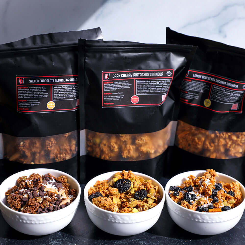 Crave chocolate? We got you. Our Salted Dark Chocolate Almond Granola is the perfect balance of rich chocolatey flavor and a touch of saltiness. We start with organic gluten-free oats and toss them with toasted organic shredded coconut and almond slivers, dark chocolate chips and rich cocoa powder, organic pumpkin seeds, crisp organic quinoa and Himalayan pink salt with a dash of organic maple syrup and mesquite powder for nutty sweetness. This rich and savory blend also packs a real nutritional punch: dark chocolate adds fiber, antioxidants and key minerals such as iron and magnesium, almonds provide antioxidants, vitamin E and protein, quinoa delivers protein, fiber and B vitamins and mesquite aids in digestion and promotes gut health. Give into your chocolate cravings and give this one a try. Good for breakfast. Good anytime.