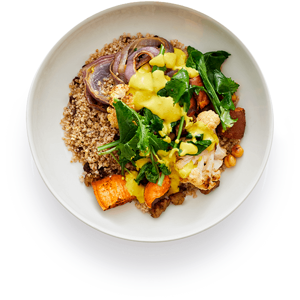 This Harvest Bowl brings together roasted sweet potato, chickpeas, cauliflower, and onion with a hearty scoop of quinoa and Beyond Meat plant-based sausage. It’s finished with kale and our signature golden turmeric tahini drizzle for a bold Moroccan-inspired flavor profile.